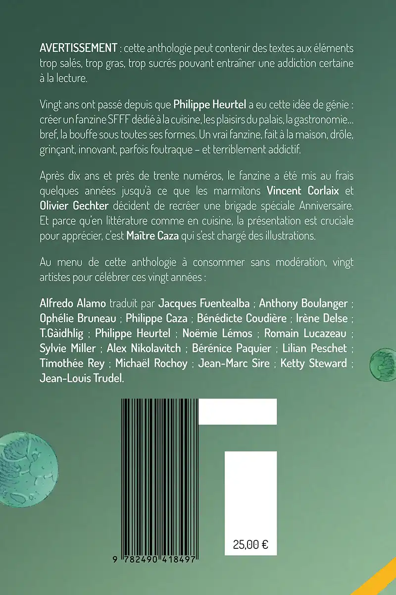 Vingt ans ont passé depuis que Philippe Heurtel a eu cette idée de génie. Créer un fanzine SFFF dédié à la cuisine, les plaisirs du palais, la gastronomie… bref, la bouffe sous toutes ses formes. Un vrai fanzine, fait à la maison, drôle, grinçant, innovant, parfois foutraque – et terriblement addictif.