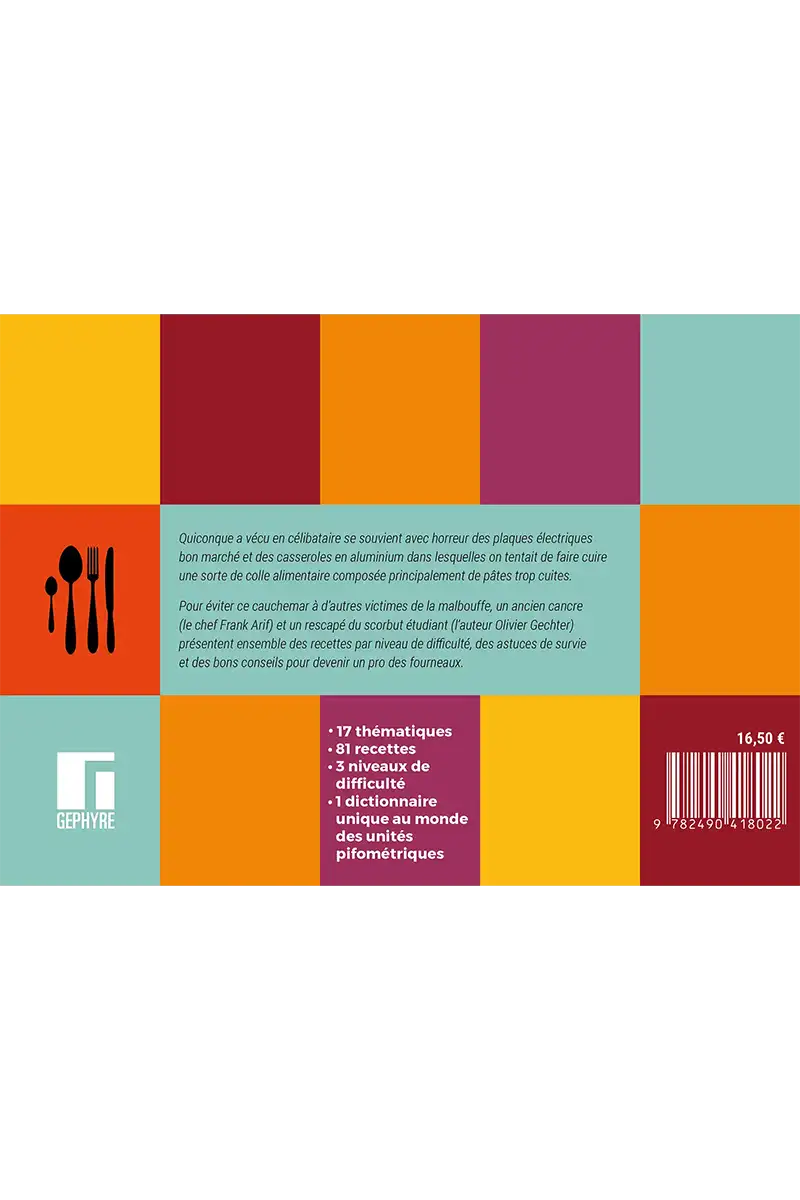 Quiconque a vécu en célibataire se souvient avec horreur des plaques électriques bon marché et des casseroles en aluminium dans lesquelles on tentait de rendre mangeable une sorte de colle alimentaire composée de pâtes trop cuites. Pour éviter ce cauchemar à d’autres victimes de la malbouffe, le chef Frank Arif et l’auteur Olivier Gechter présentent ensemble des recettes par niveau de difficulté, des astuces de survie et des bons conseils pour devenir un pro des fourneaux. Et des illustrations de super héroïnes et super héros, parce qu’il faut au moins des super pouvoirs pour apprendre à manier la kitchenette quand on débute en cuisine.